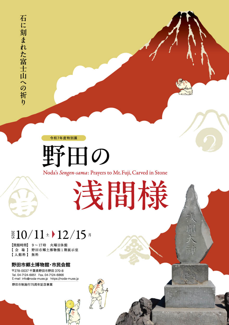 日本一の高さを誇る富士山は、古来より、信仰の対象となってきました。特に、江戸時代後期にかけて、富士山を信仰する人たちの仲間である富士講が数多く成立していきます。野田市域では、明治時代を中心に、富士山の信仰に関わる石造物が数多く建立されており、これらは現在でも見ることができます。