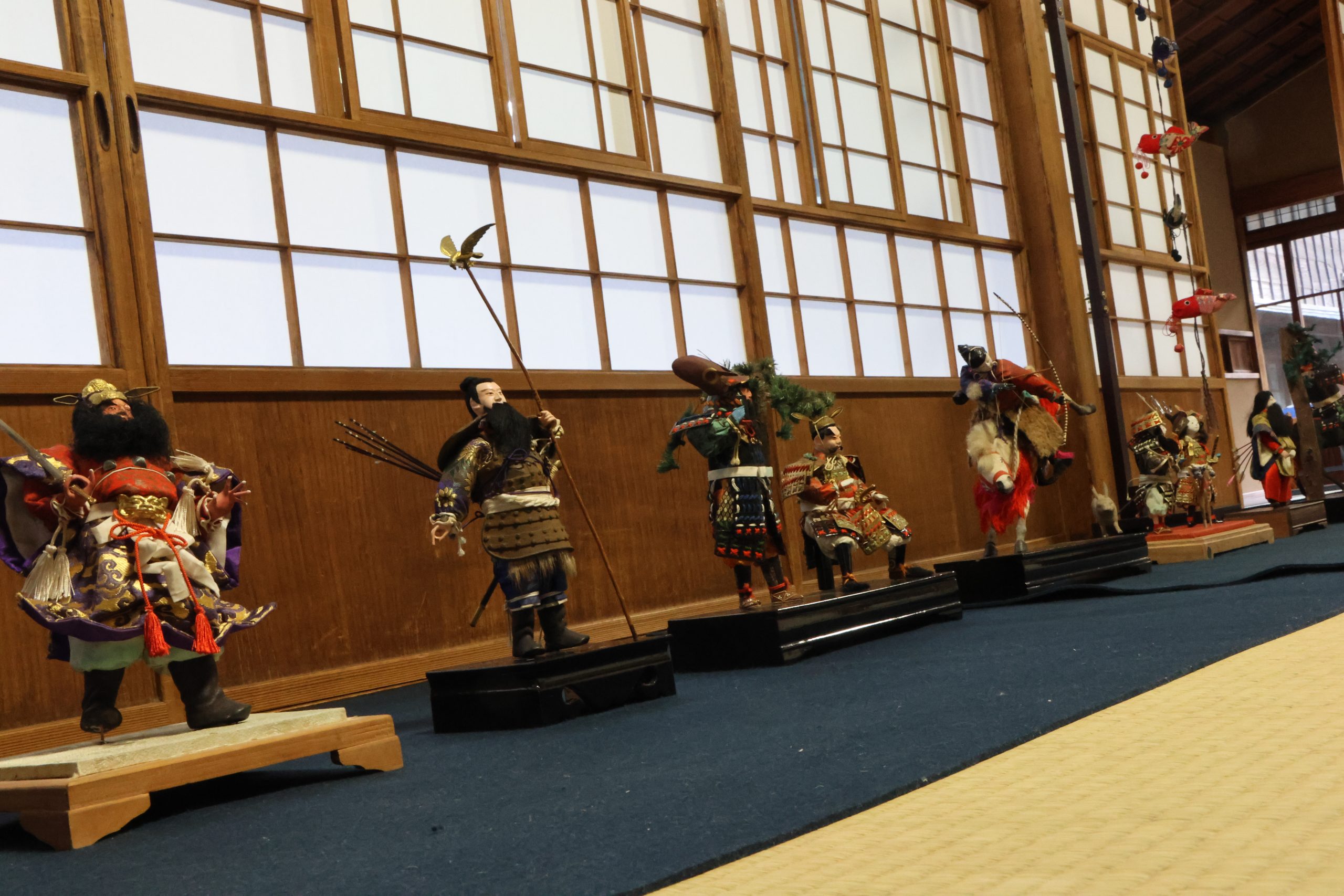 松の間五月人形。今回の公開が初公開となります。大正~昭和初期の五月人形です。鍾馗、神武天皇、加藤清正など様々な人形があります。