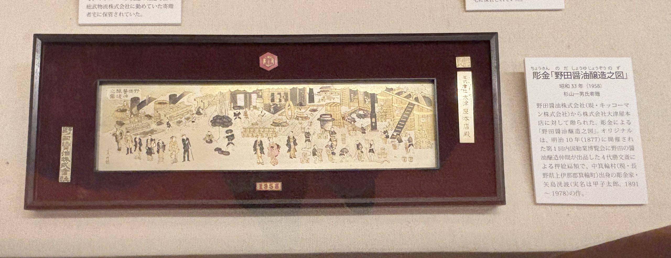 常設展にて展示中の押絵扁額「野田醤油醸造之図」の精巧な彫金